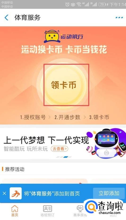 然后我们点击立即开启,之后我们每天就可以根据我们的步数来领取卡币了;