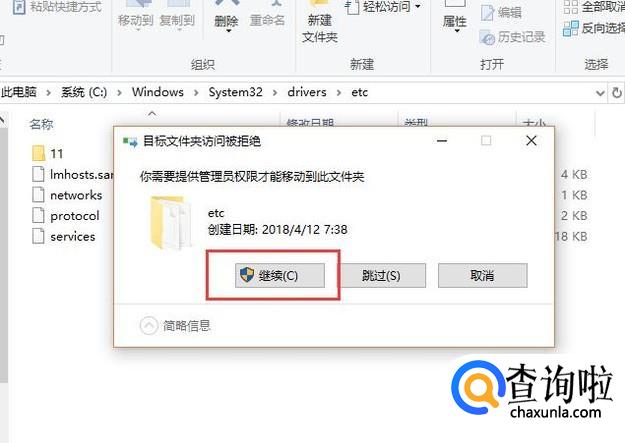编辑好以后在将hosts文件拖入etc目录下面,这时会弹出如下图所示的提示,我们点击继续即可