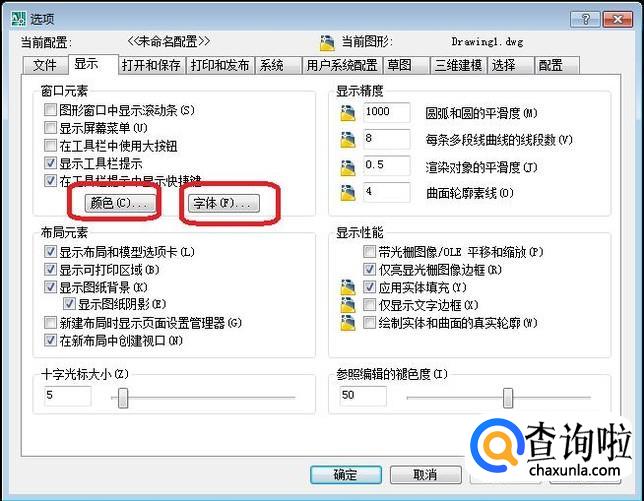 进入选项面板,如图所示,点击“显示”标签,就可以对看到“颜色”和“字体”两个按钮,分别点击就可以对窗口颜色和命令行字体进行设置。