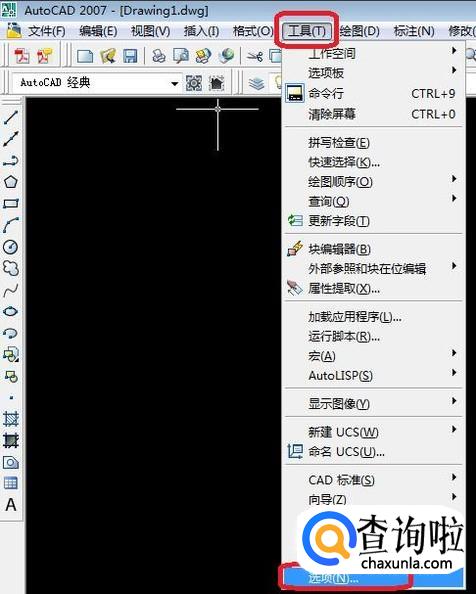 首先,打开CAD软件,如图所示,点击菜单栏“工具”,选择“选项”。