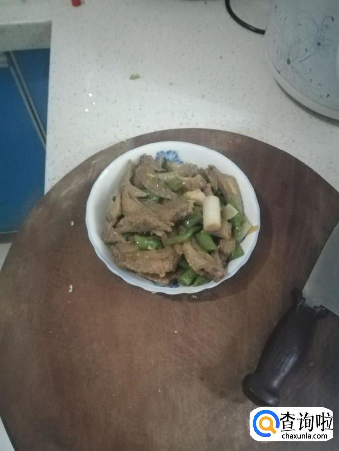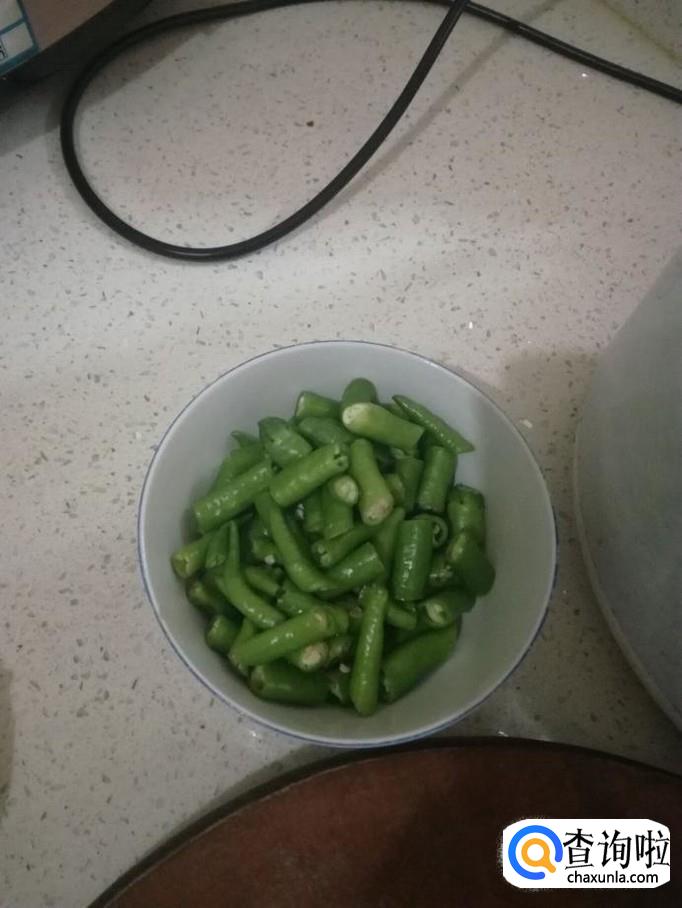 把青海椒清洗干净,用刀切成长圆筒状,装在碗里备用。