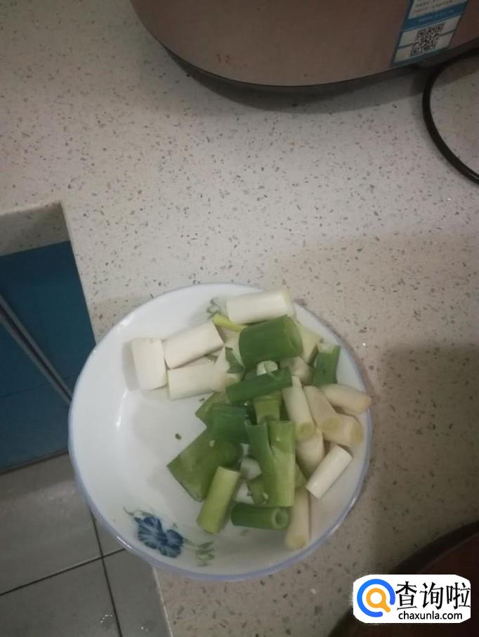 把大葱清洗干净,然后把根茎部分切成圆筒状,叶子部分切成小段状装在盘里备用。