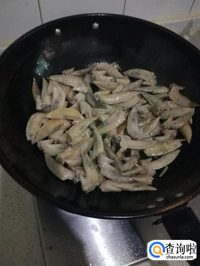 待锅里的油烧滚后,转小火,将沥好的鸡翅倒入锅里。