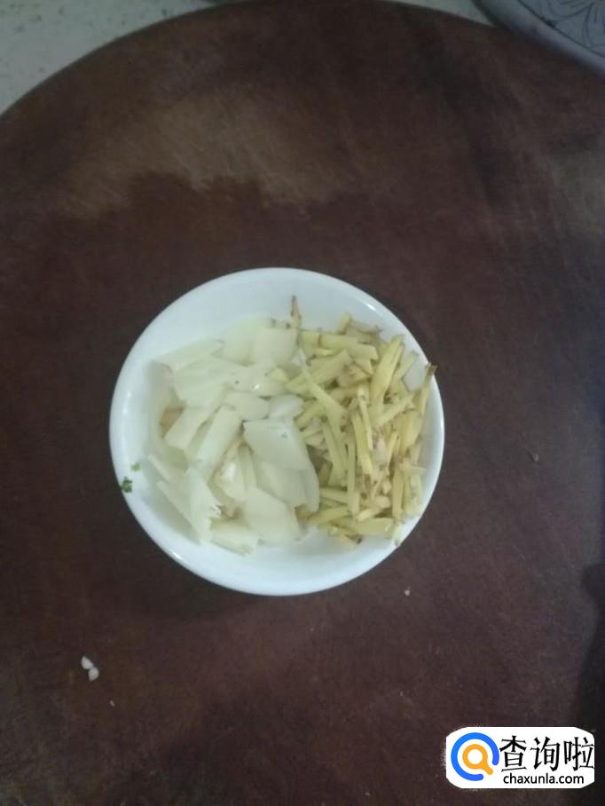 把姜蒜清洗干净,然后把姜切成丝状,蒜切成片状,装盘备用。