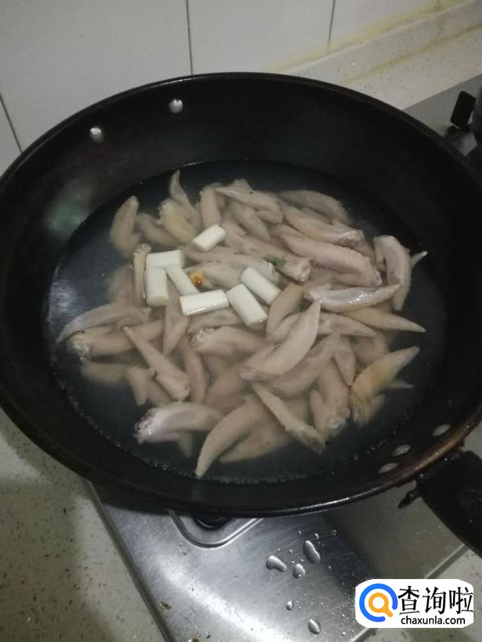 然后把洗好的鸡翅倒入锅里,加入适量葱段,盖上锅盖,水煮鸡翅10分钟左右。