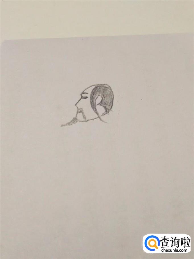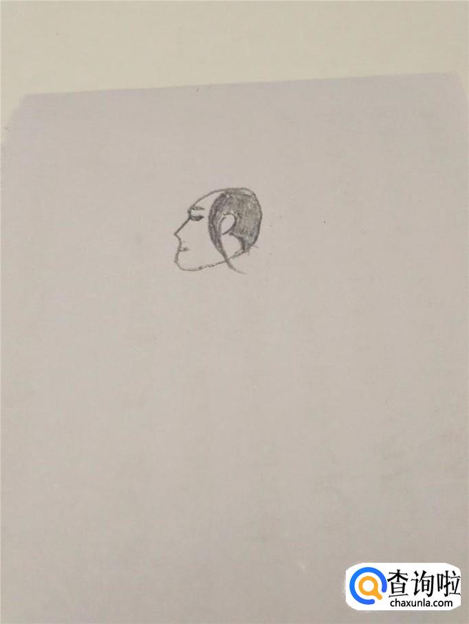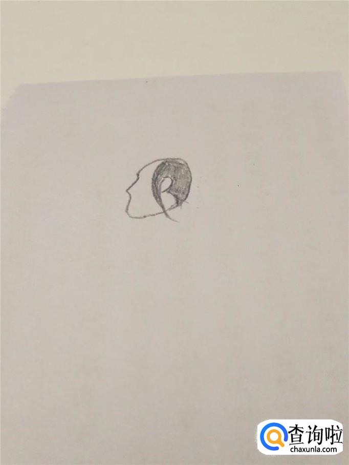 在头的上半部分画出头发,在头发中间留出一只半圆形的耳朵,耳朵左侧一缕长发弯弯地飘向脖子后面。用铅笔把头发涂成黑色。