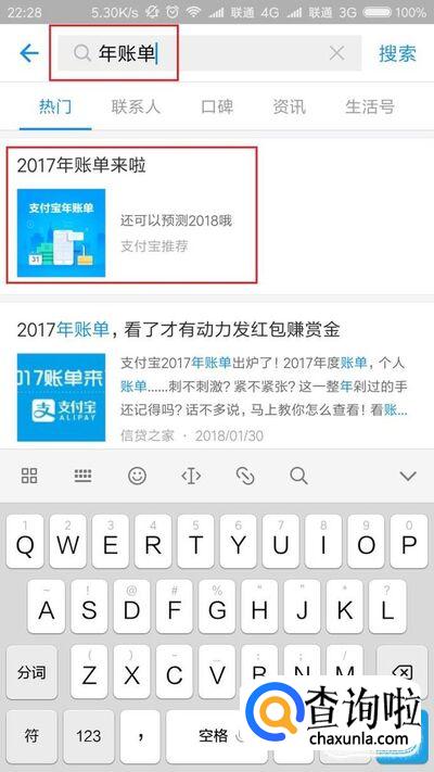 在首页面的搜索框中输入“年账单”关键字,在下面的待选项种选择“2017年支付宝年账单”。