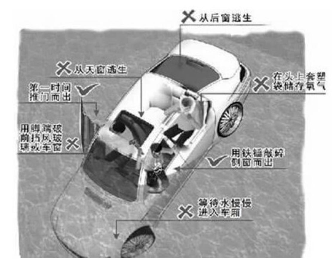 假如车内没有任何可以敲碎玻璃的硬物,车内乘客可以把车窗打开一条缝,干脆让水流进车内。等车内快注满水,车内外压力接近时,车门就会比较容易打开。