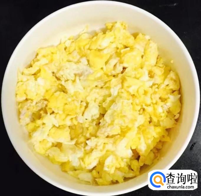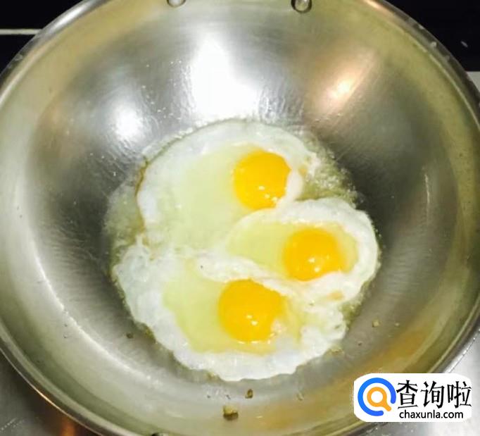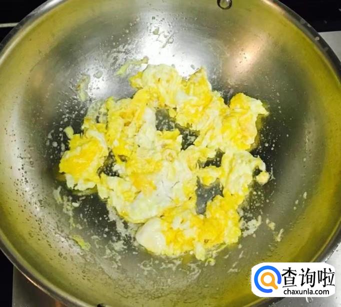热锅加入适量的花生油油打入三个鸡蛋,撒一点点盐炒香后盛出备用。这种炒法是为了把鸡蛋炒出黄、白两种颜色