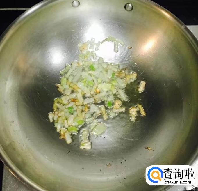炒完黄瓜后把锅洗净烧热后加入适量的花生油放入葱花爆香,倒入凉米饭加入适量的盐中小火翻炒均匀。