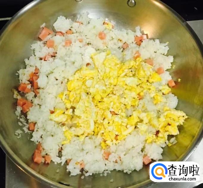 放入火腿肠丁和炒好的鸡蛋碎旺火翻炒均匀