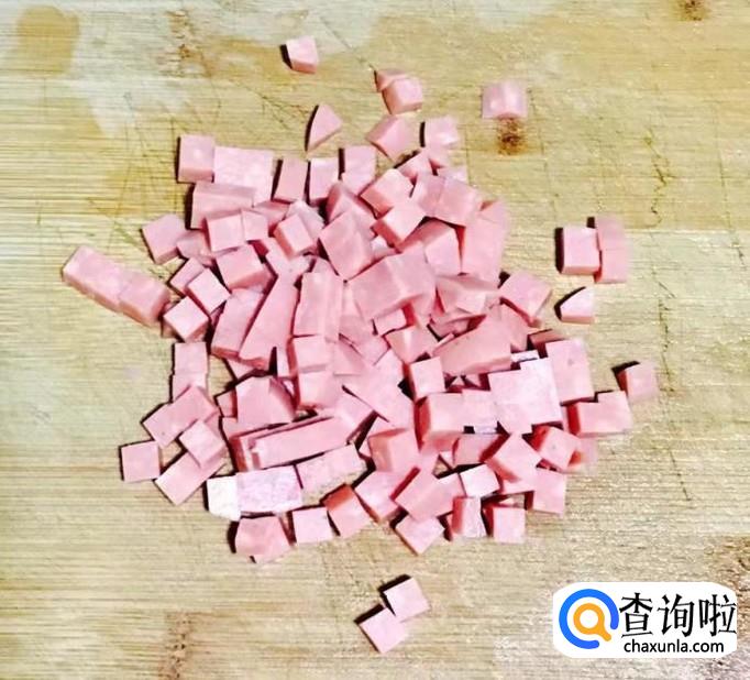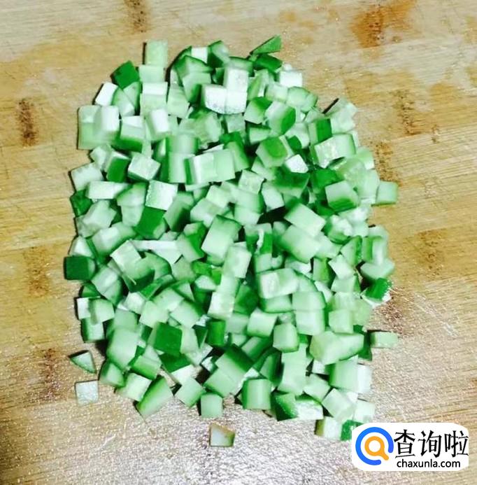 黄瓜一根清洗干净后切成小黄瓜丁,火腿肠一根同样切成小丁