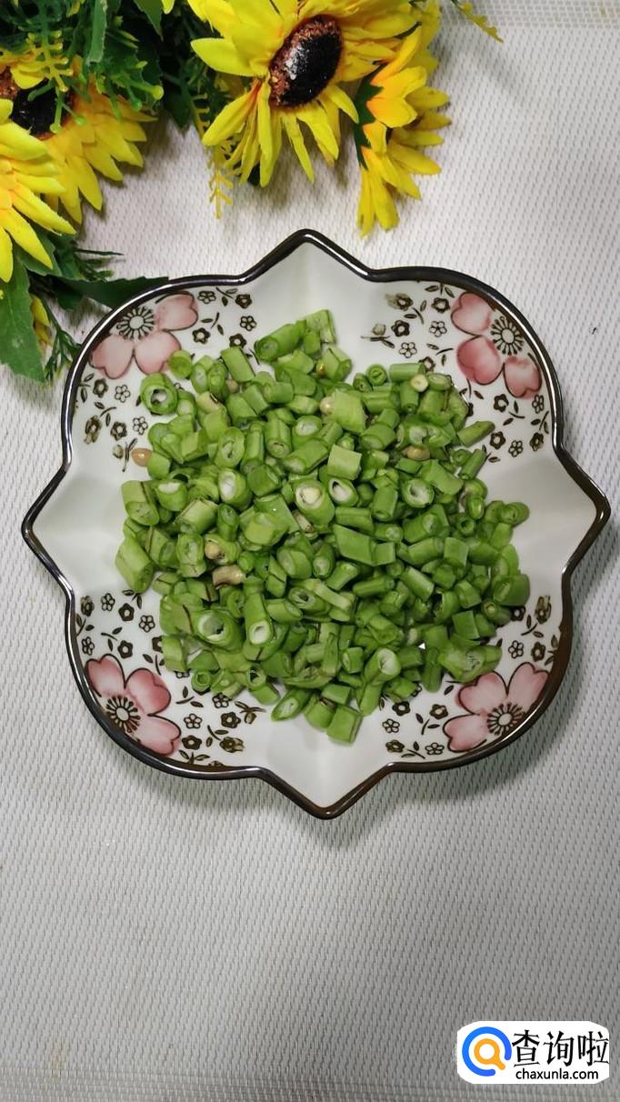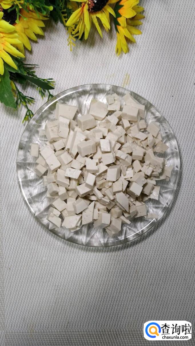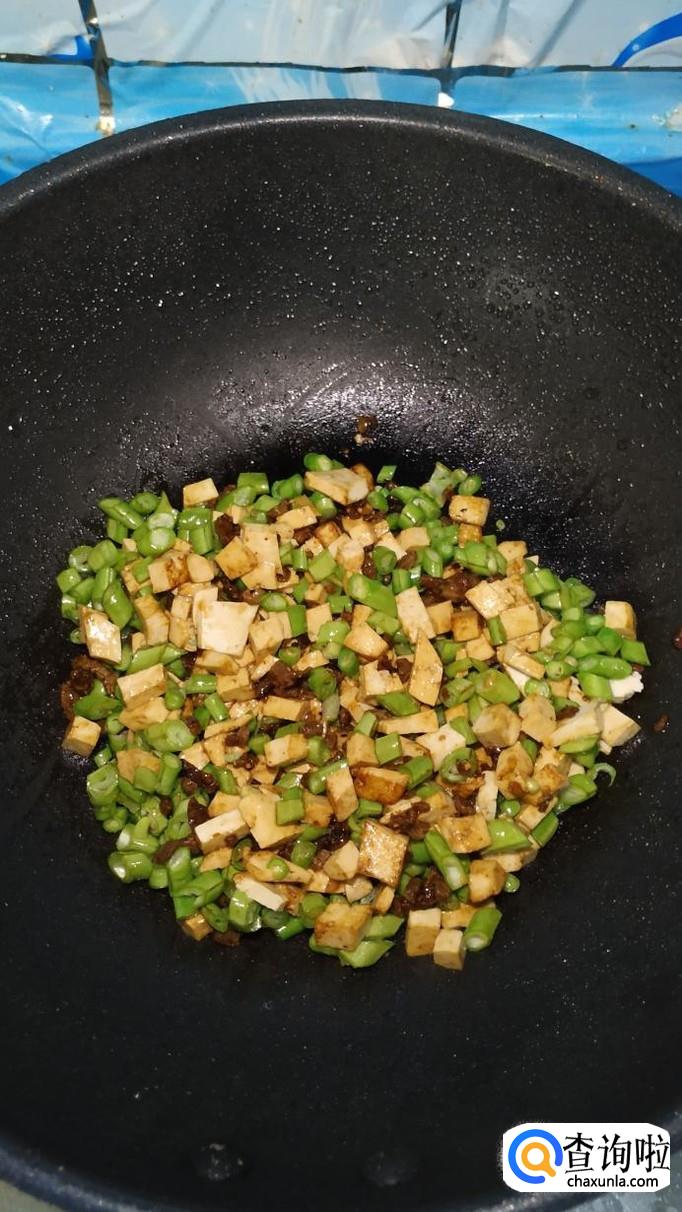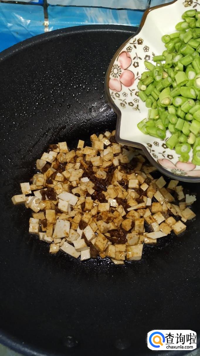 将老豆腐切成小丁儿,豆角切碎,将牛肉也切成小丁。注意,新鲜的牛肉可以放在冰箱里稍微冻一下,这样更好切。