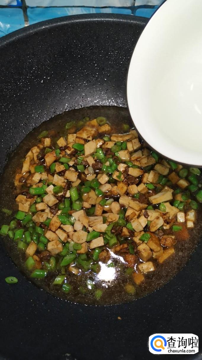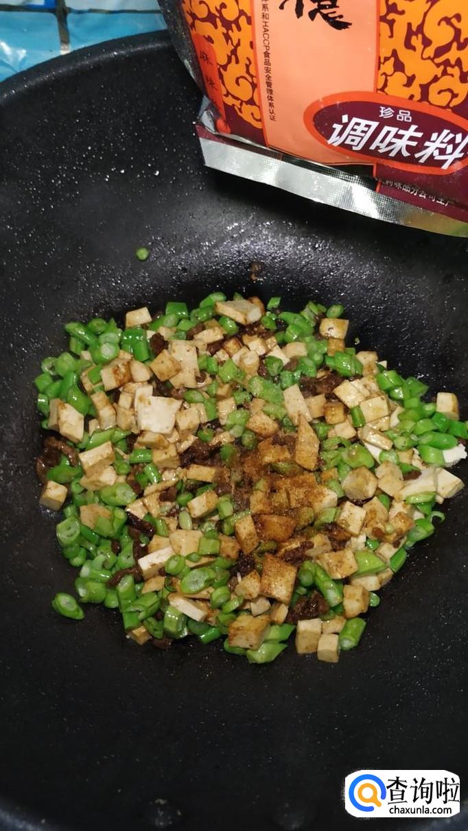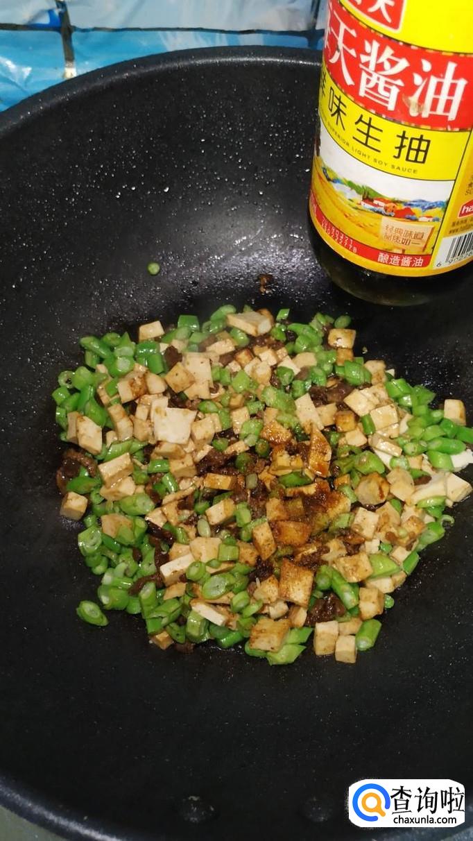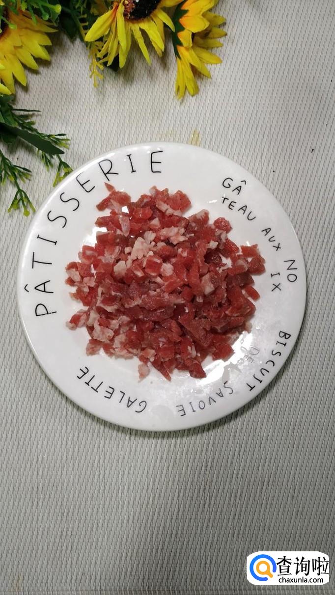 将老豆腐切成小丁儿,豆角切碎,将牛肉也切成小丁。注意,新鲜的牛肉可以放在冰箱里稍微冻一下,这样更好切。