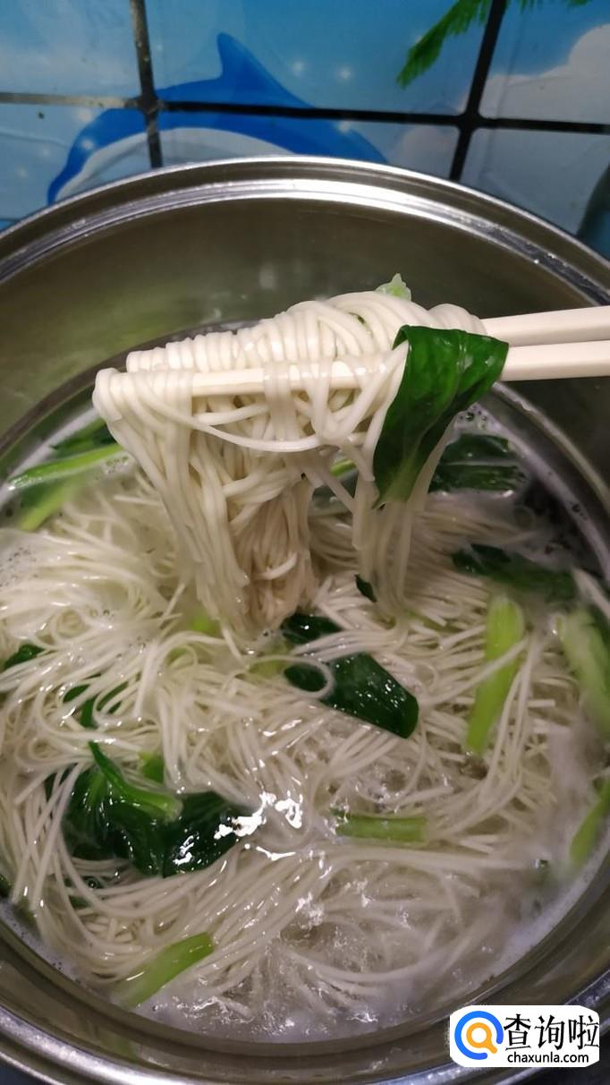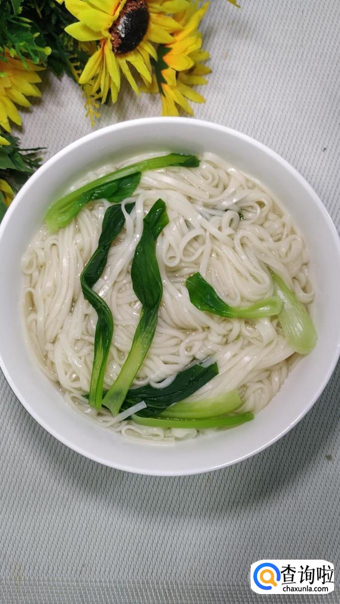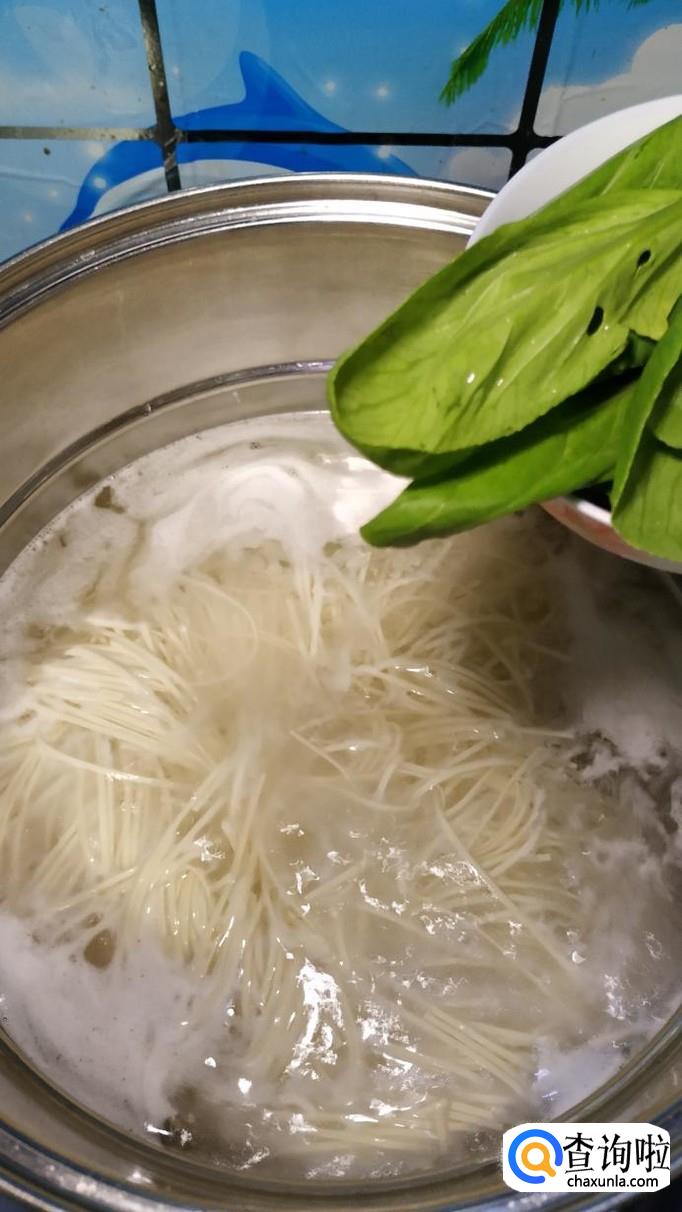 汤锅中烧开水,水开后将面条下入锅中,再加入少许青菜,煮熟后捞出,放入碗中备用。