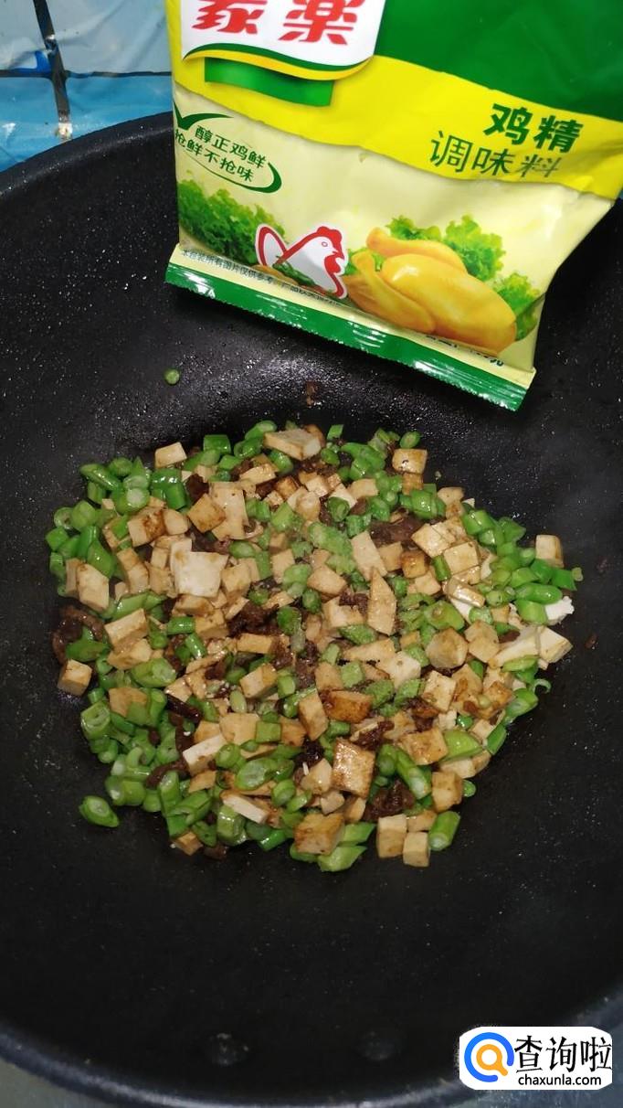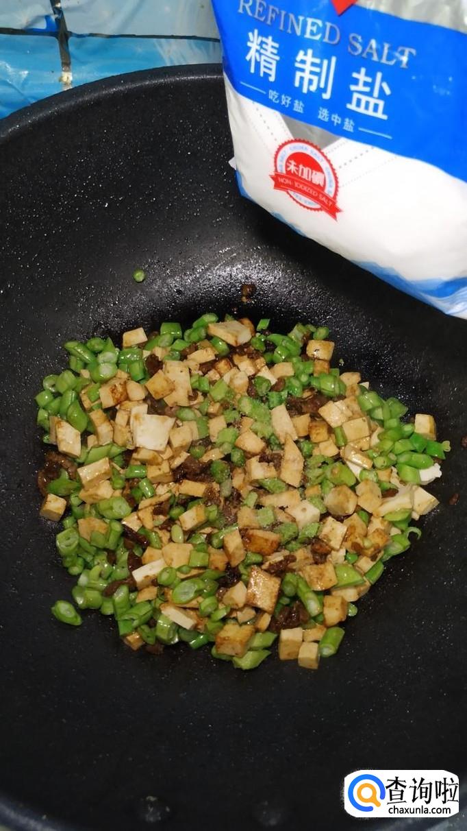将豆角倒入锅中,翻炒均匀。豆角切碎以后,也非常容易熟,嫩嫩的绿色,和食材配起来更加好看。