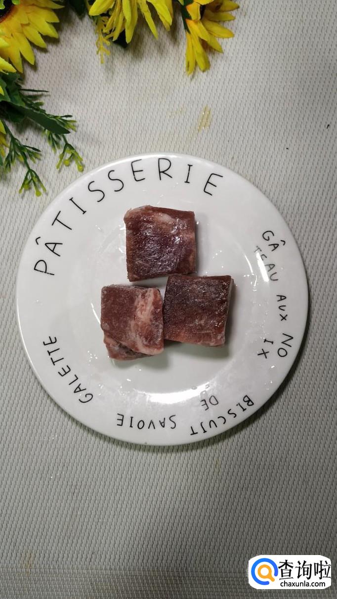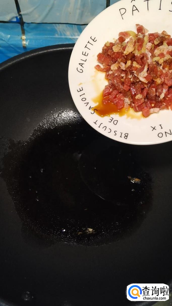 炒锅中放入适量油,油热后,将牛肉粒放入锅中炒香,牛肉切得小一些,这样更容易熟。