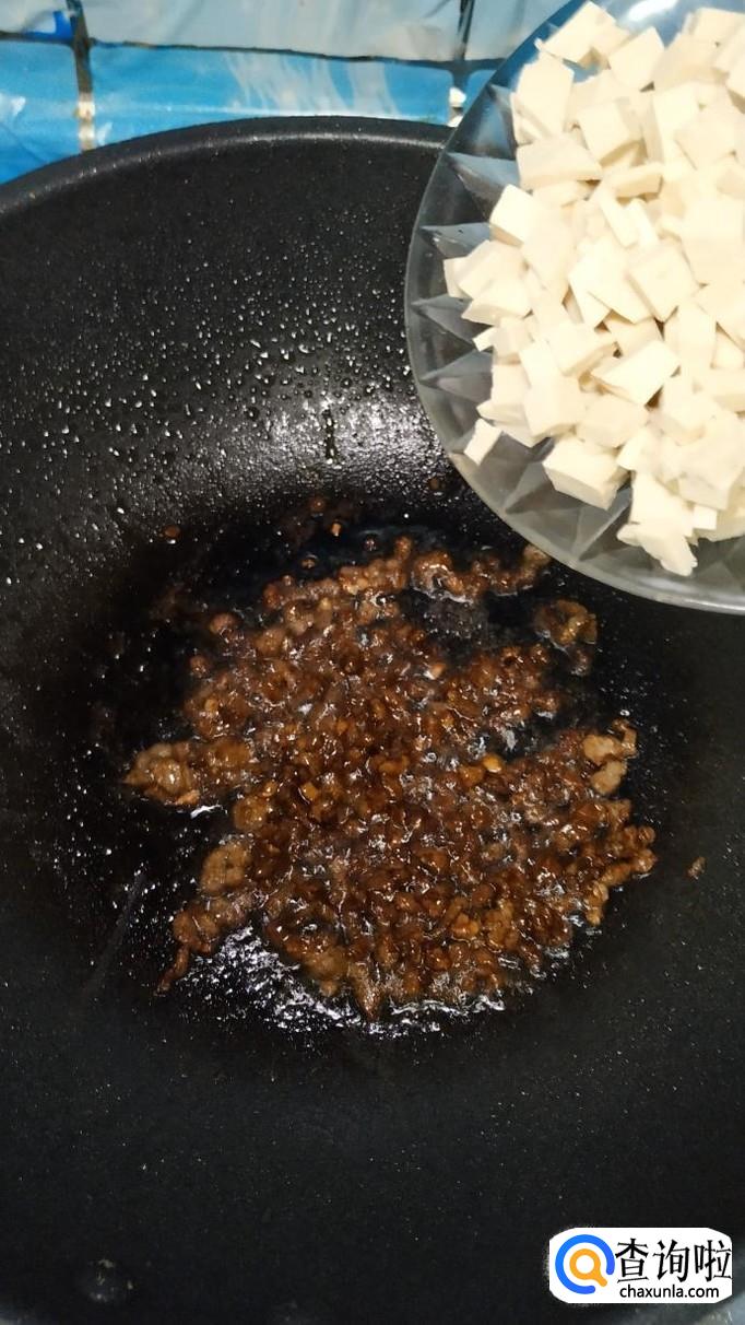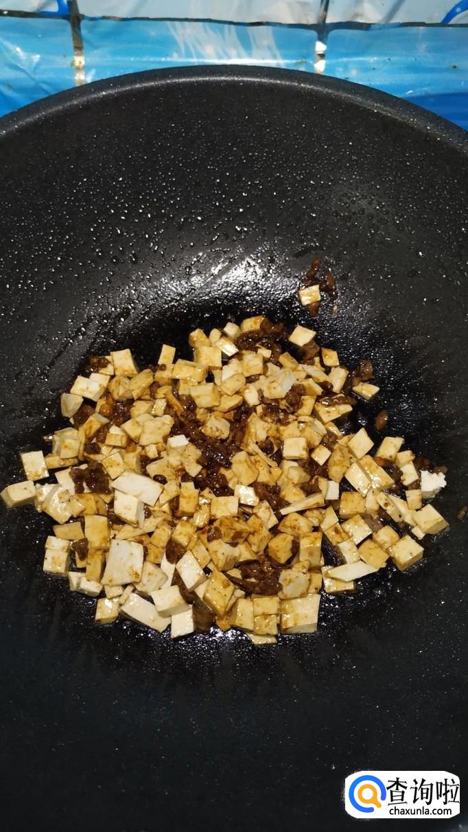 准备一勺甜面酱,倒入锅中,和牛肉一起炒一下,然后将准备好的豆腐块儿倒入锅中,翻炒均匀。