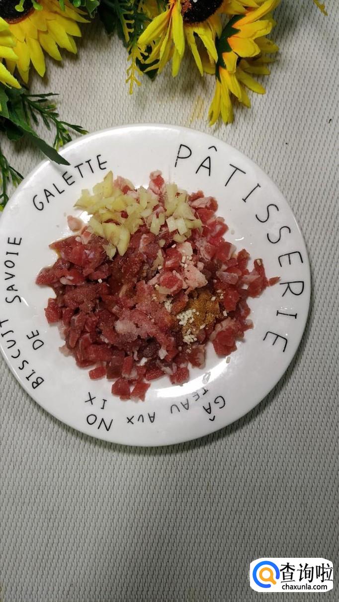 准备适量姜,切碎后,放在牛肉上面,再放入适量盐,鸡精,五香粉,生抽,料酒,搅拌均匀,腌制15分钟左右。