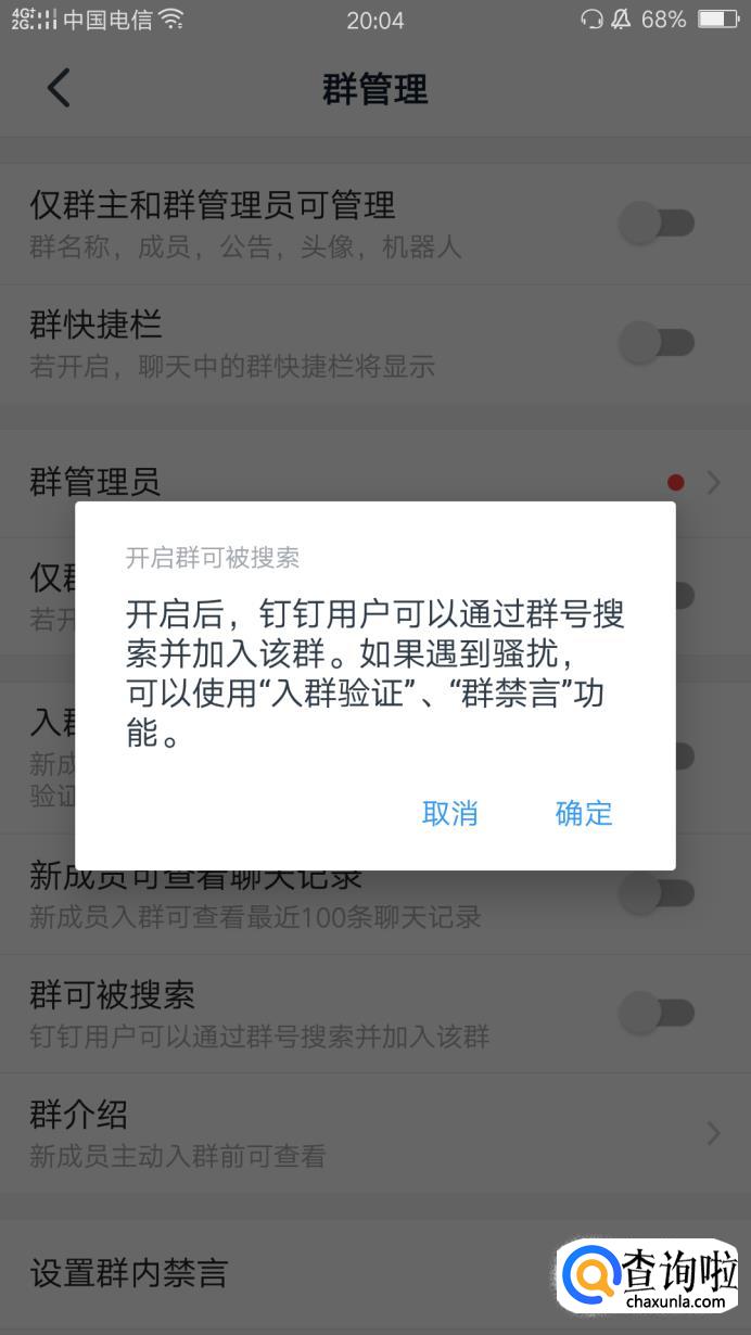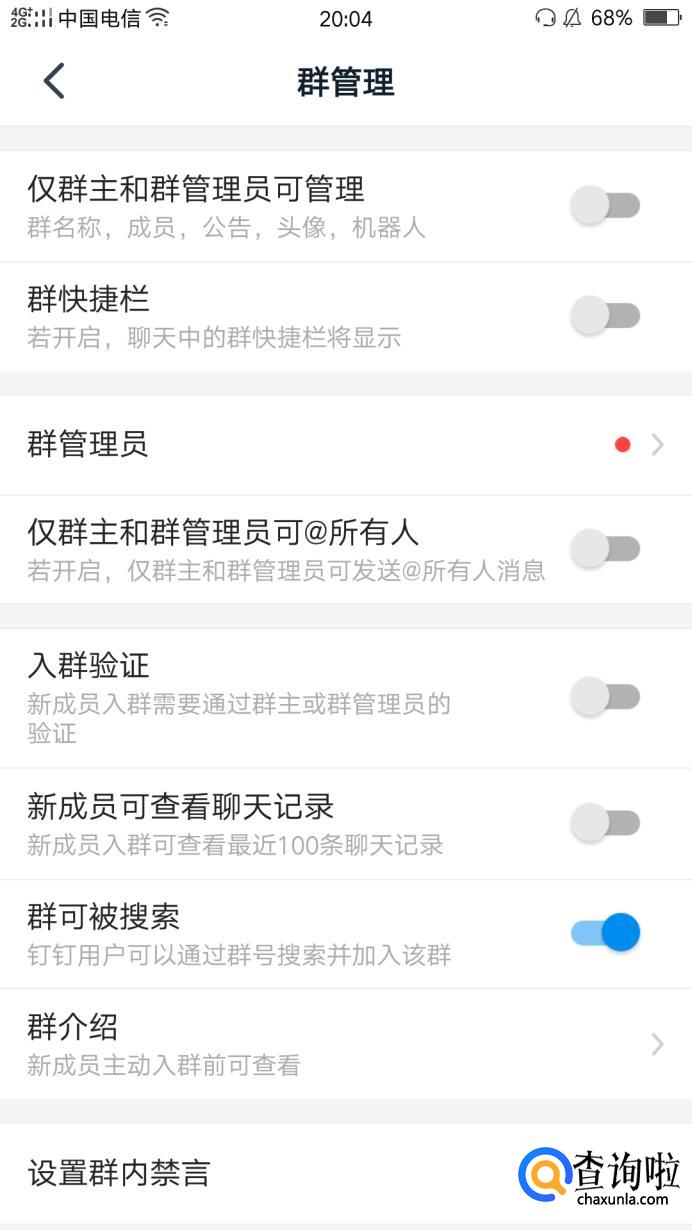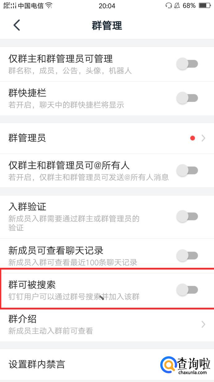 在群管理界面我们可以看到群可被搜索功能默认是关闭的,我们将之打开。