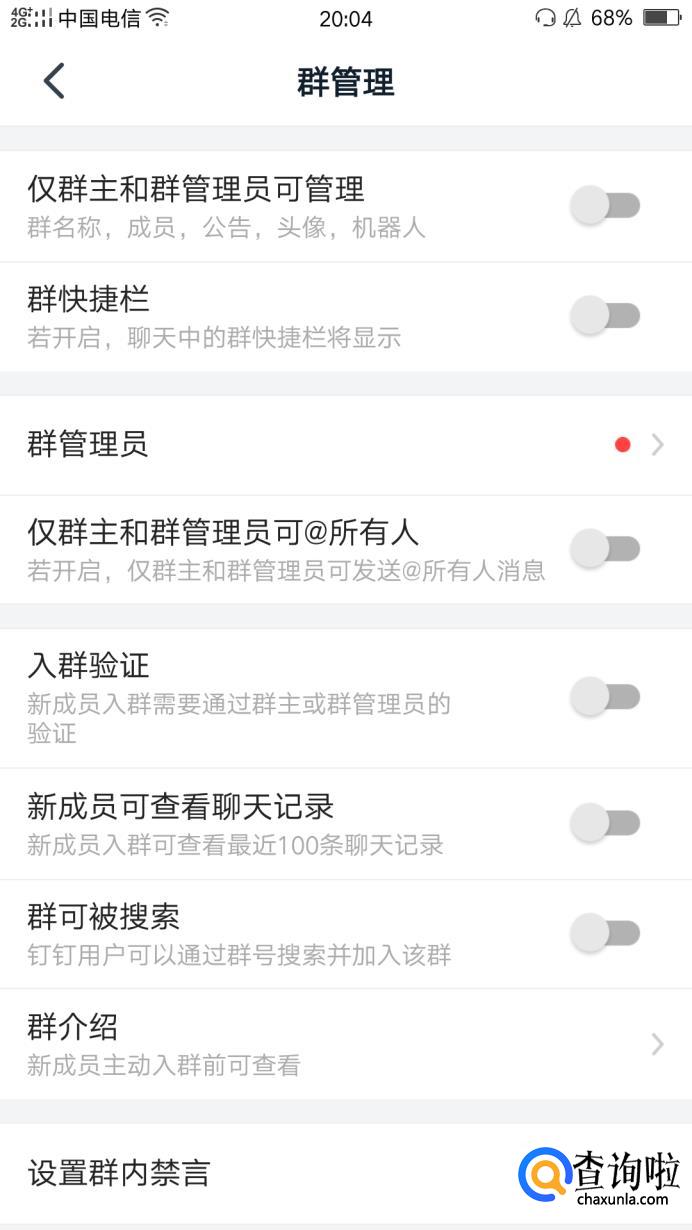 要想主动加钉钉群,那么钉钉群聊的管理员必须先设置了群可被搜索,这个功能是默认关闭的,开启后就可以直达钉钉群号了。