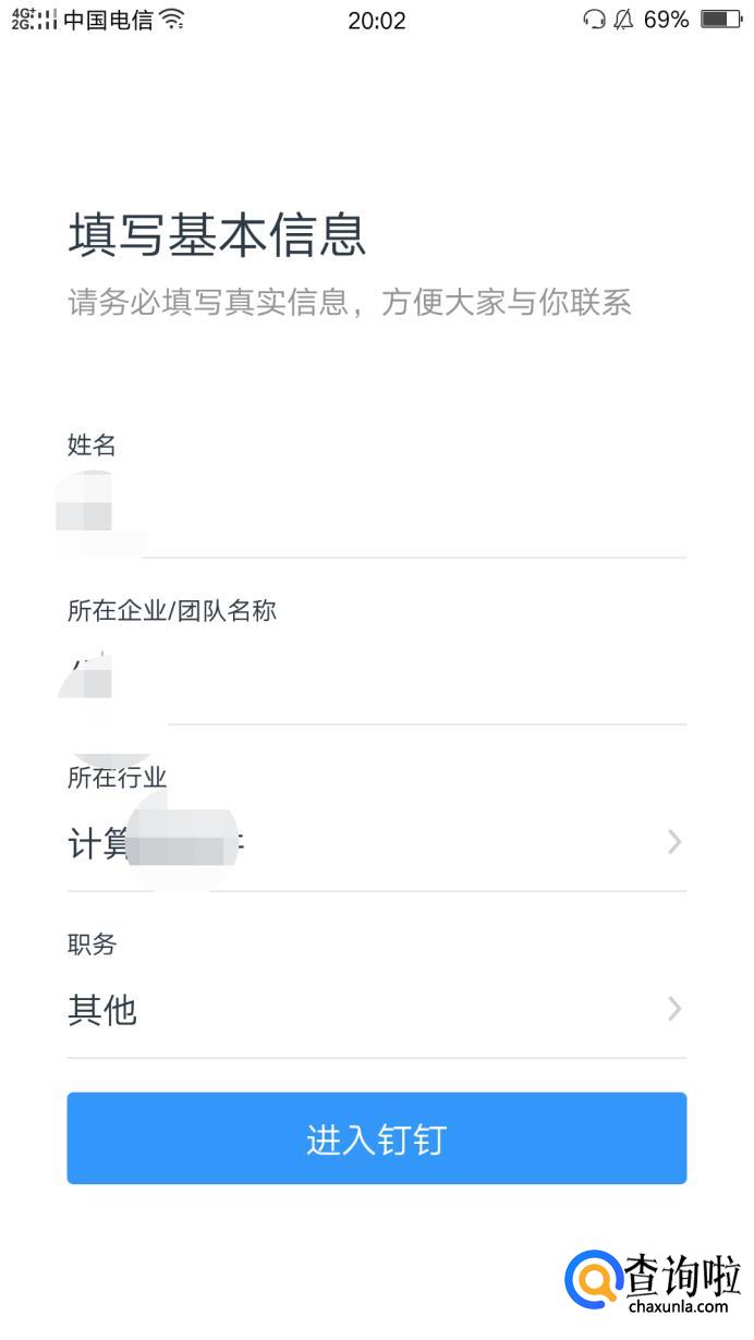 信息填写完毕后,点击下方的进入钉钉。