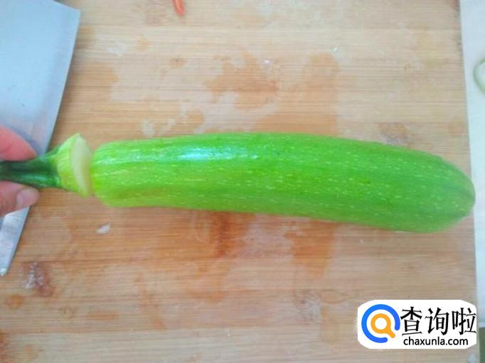 角瓜清洗干净,表皮用小苏打粉搓几下,然后冲洗干净,用刀将角瓜的头切掉不要。