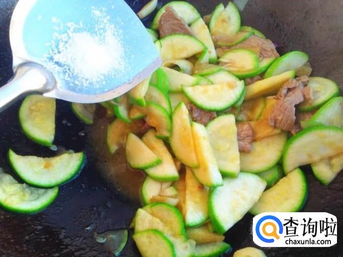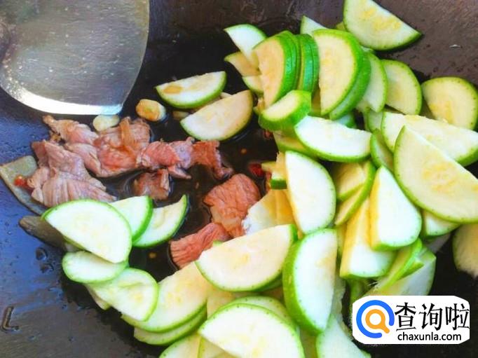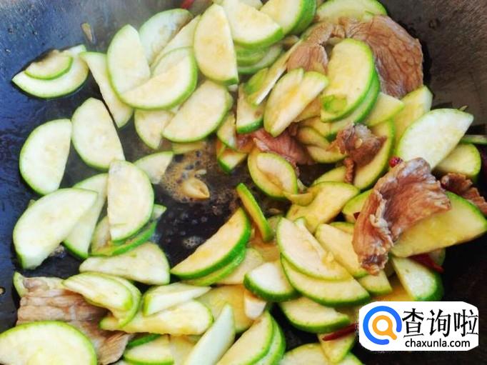 肉片切的特别薄,所以很快就炒熟了,将角瓜片倒进去。