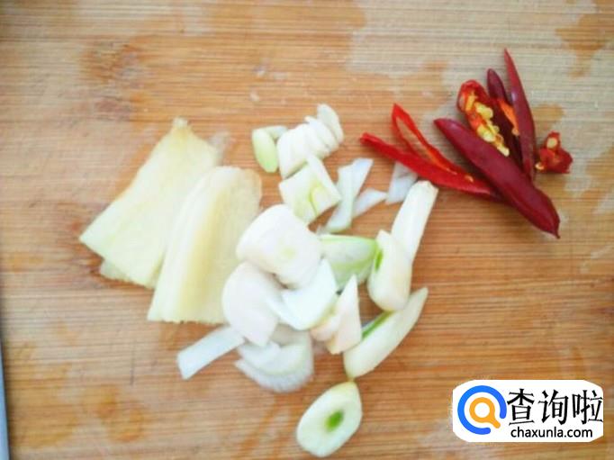 葱切葱花生姜大蒜都切片,再准备一点点干红辣椒丝,既能提味看着也漂亮哦。