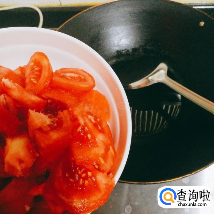 将买来的番茄在温水中浸泡去皮之后,切成块状。