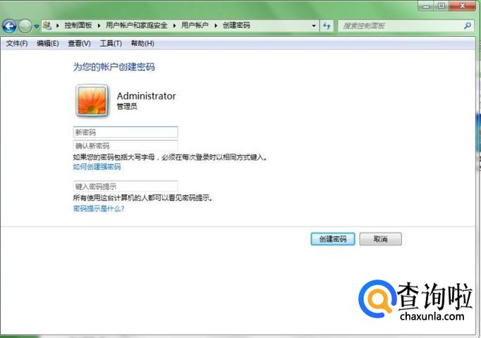 此处可以看到需要设置密码,还可以设置“密码提示”,根据自己的需要点击输入要设置的密码并确定创建密码。