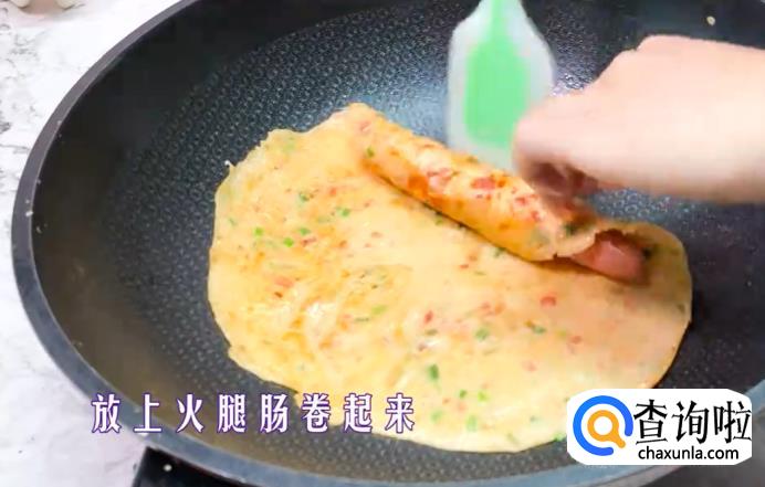 放入一根火腿后开始卷起来。