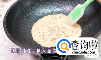 锅里刷上油之后,将面糊倒入摊平。
