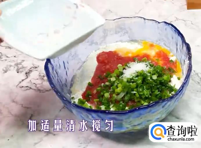 在鸡蛋和面粉里加入番茄、适量的葱花、盐和清水搅拌均匀。