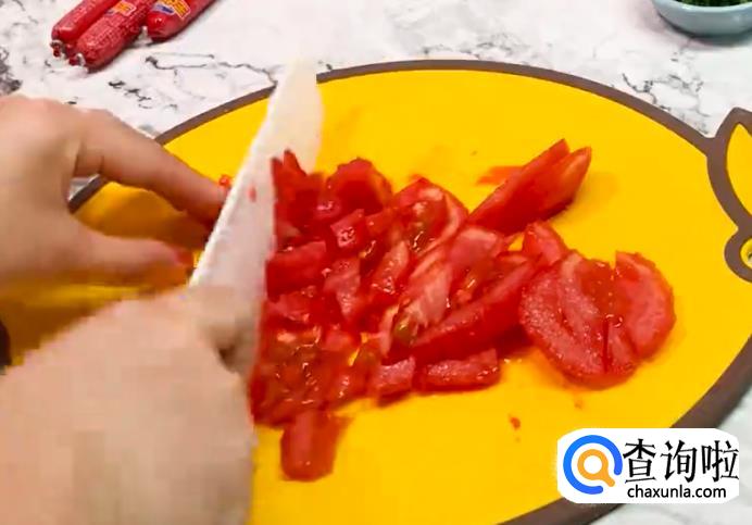 番茄放开水里烫一下后去皮,然后切成块状。