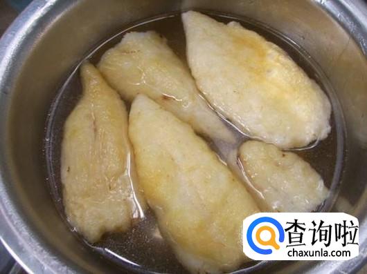 想要发出来的鱼肚油保证质量油温一点不要过高,过高的油温容易把鱼肚炸焦,不要炸的外焦里不透。基本上炸出形就可以了。