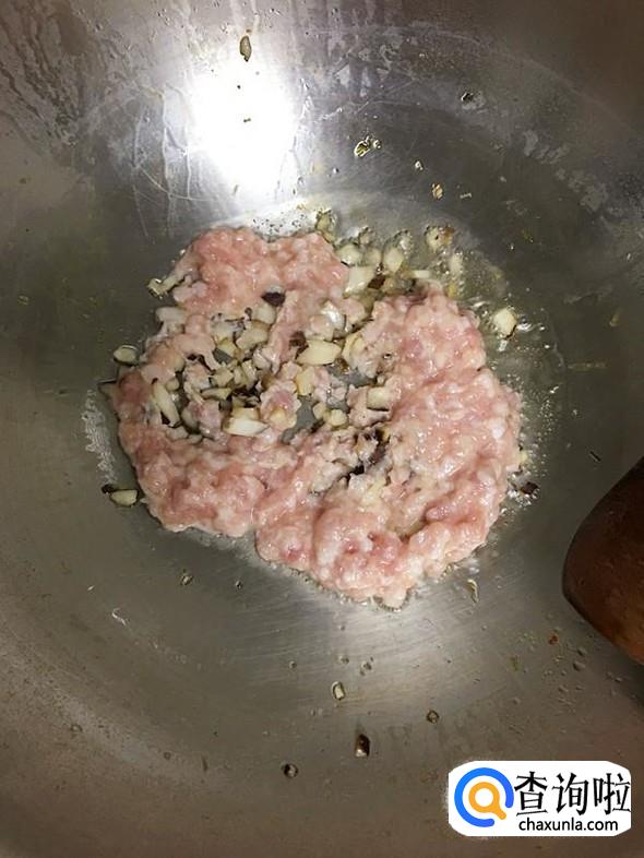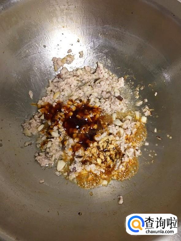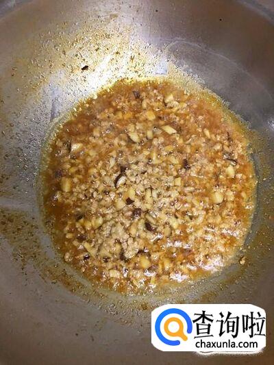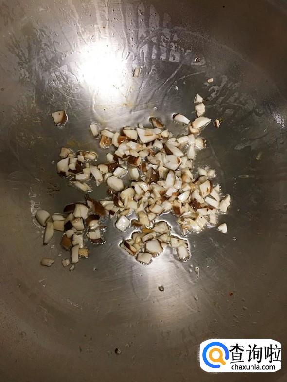 炒至香菇粒变软,加入肉糜。