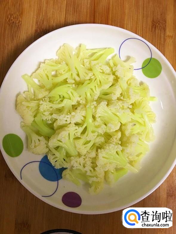 烫熟的菜花捞出,控干水分后放入盘中待用。