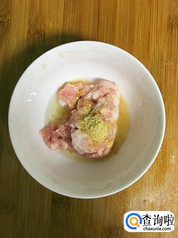 肉糜放入碗中,依次加入1小勺料酒和生姜粉,搅拌均匀。