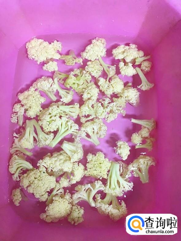 水中放入1小勺盐,搅拌至溶化后,把掰成小朵的菜花放入浸泡5分钟左右。