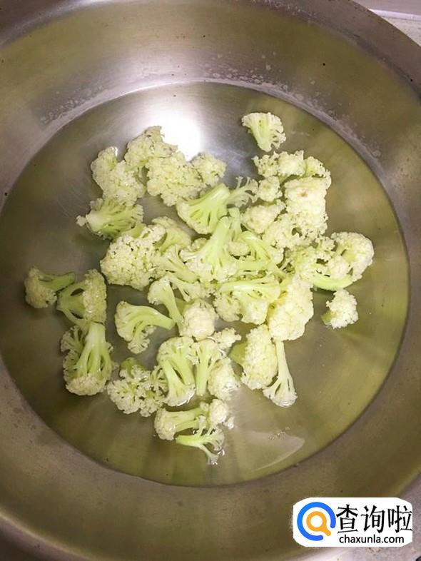 锅中加入适量水,大火煮开后放入洗净的菜花,再次煮开,然后转中火2分钟左右,把菜花烫熟。