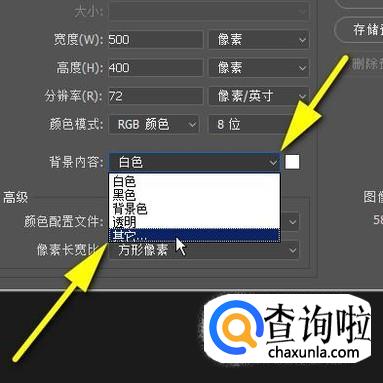 打开新建文档的对话框,在给背景内容这里点击下拉按钮,在弹出的列表中选择:其它