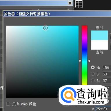这时,弹出拾色器,从中选择蓝色,再点确定。返回到新建文档对话框再点确定。