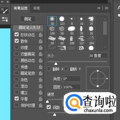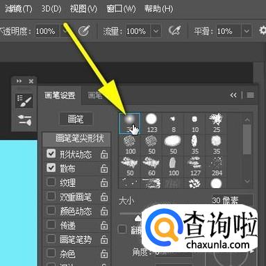 在“画笔笔尖"这里选择柔角30画笔;
