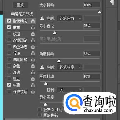 勾选”形状动态“并点击一下,打开其设置面板。