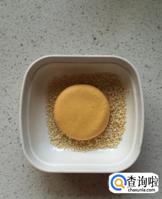 收紧口,搓圆,按扁,两面均沾白芝麻。