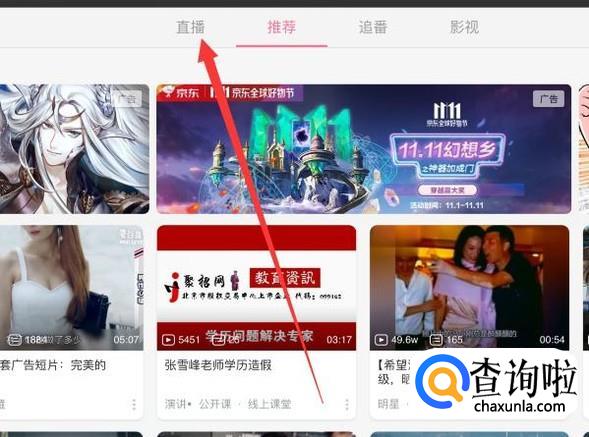 进入之后,点击“直播”,切换到直播页面,如图所示。