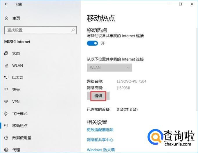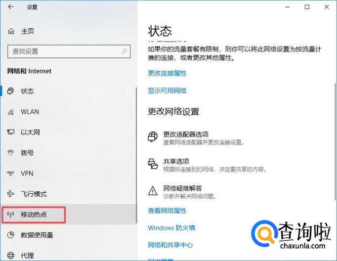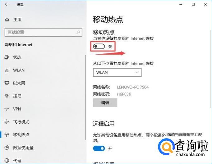 弹出的界面,我们先将移动热点的开关向右滑动打开;