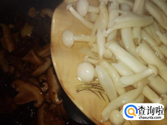 翻炒入味,然后倒海鲜菇里的汤汁进去。