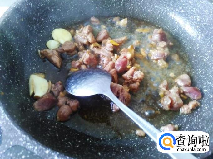 再用另一个锅,开火下油,放蒜米进去爆出味来 ,然后放肉丁进去翻炒至变色。